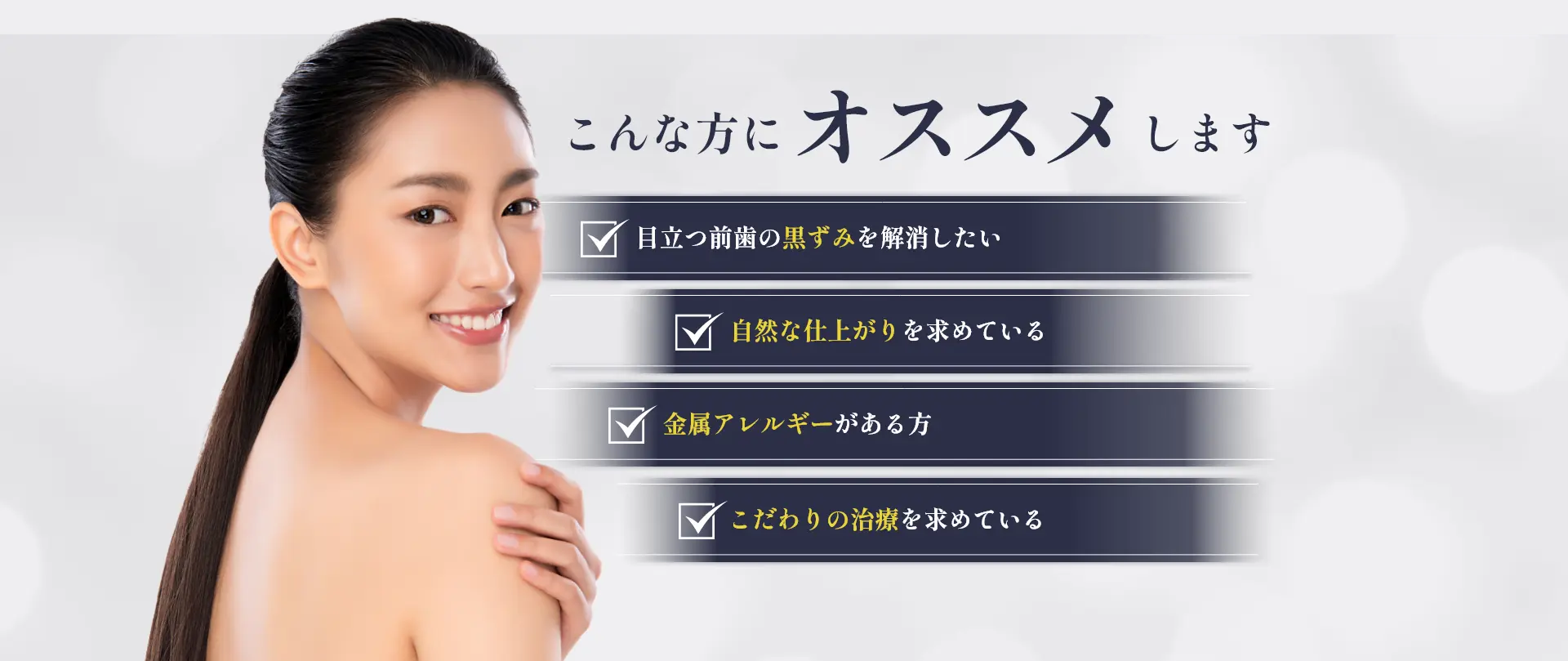 オールセラミック治療で、見た目を改善するだけでなく体にも優しい治療を。 オールセラミック治療は、全て光を透すセラミックで出来ているので、透明感に優れた綺麗な仕上がりで、本物の歯と見分けがつかないほどの質感を実現します。 また、金属を使用していないので、体に金属アレルギーをお持ちの方でも安心して治療を行うことができ、加齢に伴い歯肉がやせてきた時に歯の根元部分に黒いラインが見えてくることもなく、見た目の気になる前歯の治療に最適です。