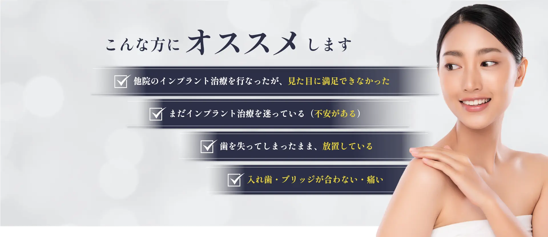 インプラントは、歯を失ったときの第一選択として考えるべき治療法で、日本でも一般的な歯科治療法になりました。 当院では、精密な検査を元に、確かな技術で失った歯の機能と見た目を回復させる治療を行います。 特に前歯部分にインプラント治療を行う場合、ただ噛めるというだけで成功したとはいえません。 しっかり噛めた上で、その見かけ(審美性)の良さは欠かすことの出来ない大切な成功条件です。