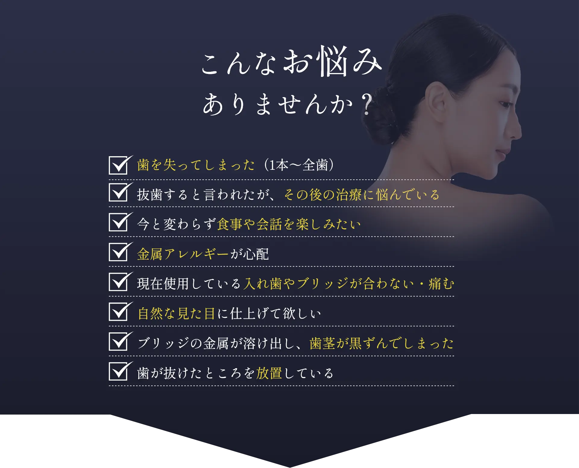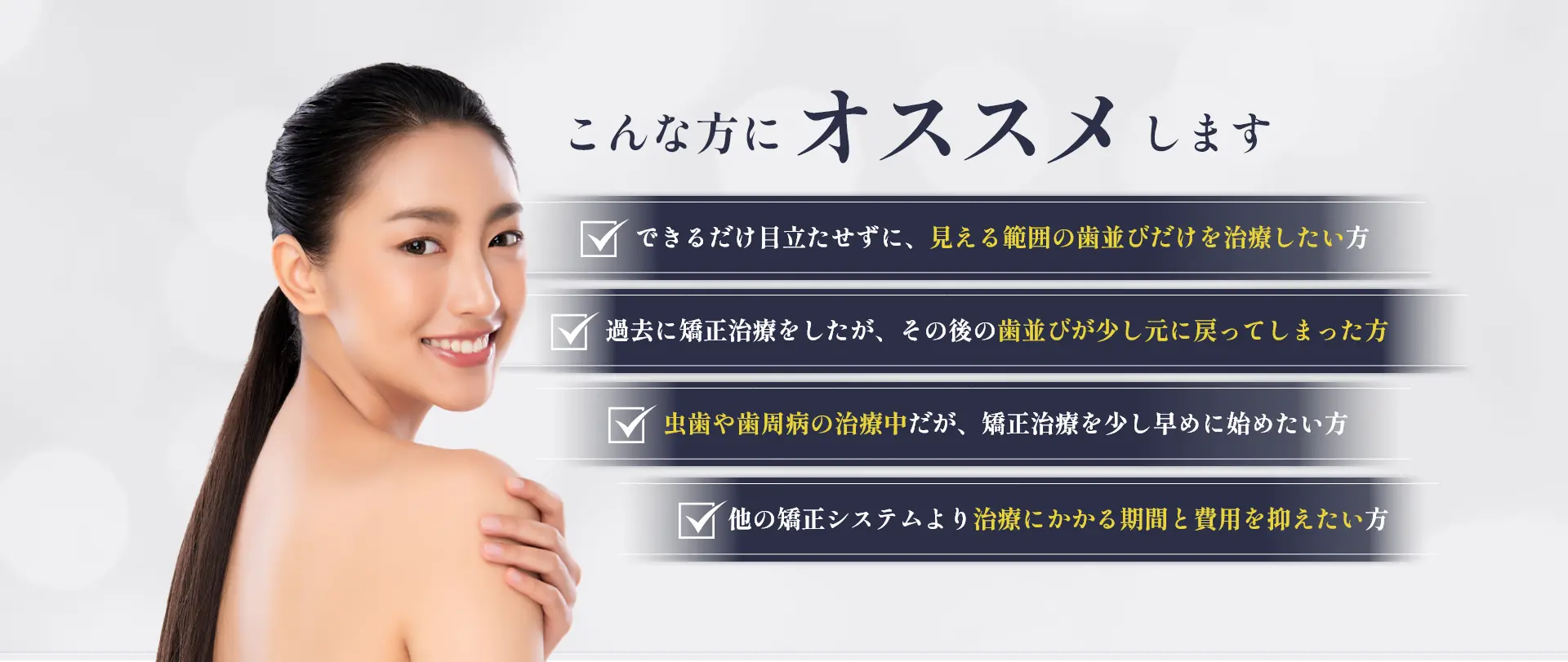 審美歯科専門スタッフが患者様と一緒に治療にあたりお悩みを改善できるよう努めます。 当クリニック治療は患者様の患者様のご不安や痛み向き合いながら細心のケアを心がけております。
